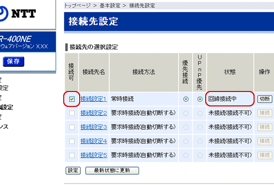 設定した接続先の[接続可]がチェックされており、[状態]が[回線接続中]になっていることを確認します。
