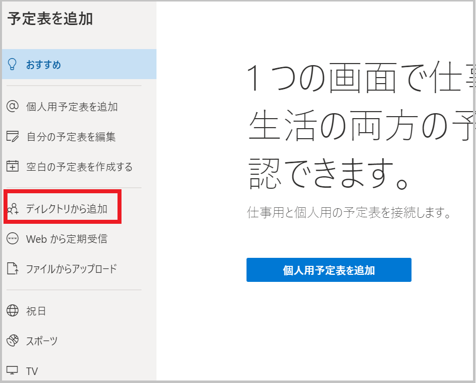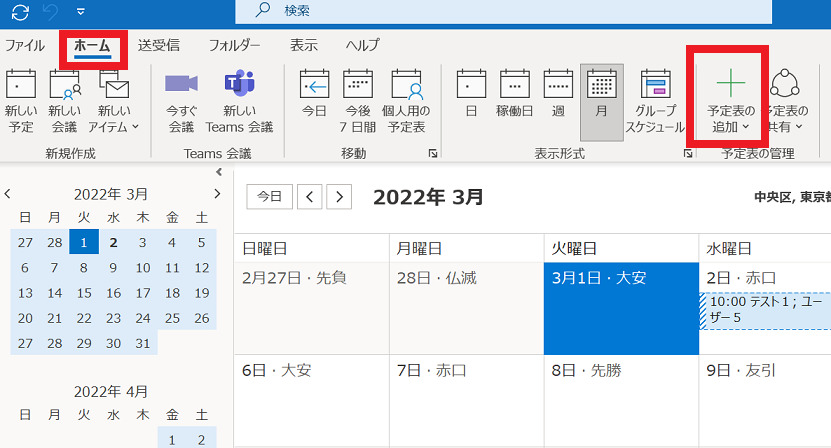 他のメンバーの予定を一覧表示する方法について、ご利用のOutlookにて「予定表の追加」を行うことで一覧表示が可能です。自分の組織のメンバーのみ追加できます。