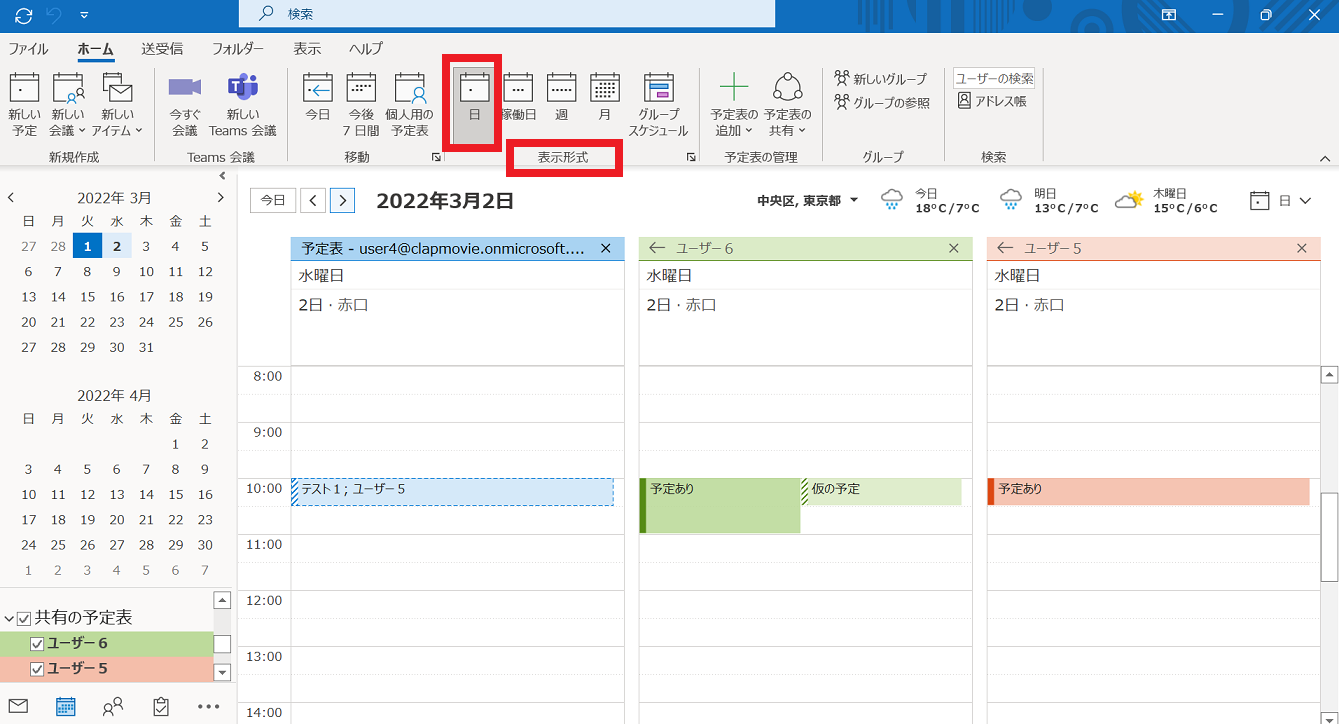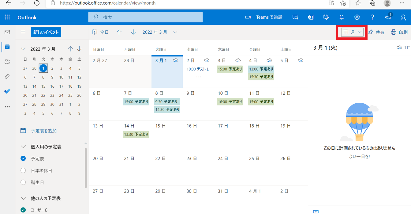 5.他のメンバーの予定表が追加されました。右上のビューが「月」になっていると分割が出来ません。