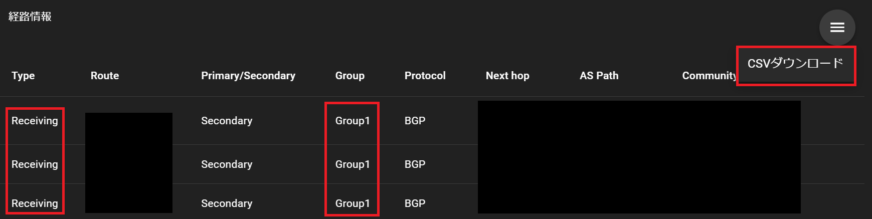 「Type」が「Receiving」となっている経路のうち、Salesforce over VPNと接続している「Group」からの経路がSalesforce over VPNから受信している経路です。