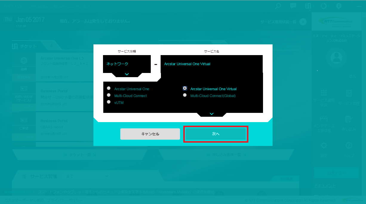 (4)チケット種別を選択する画面が表示されるので、「サービス分類」で「ネットワーク」を、